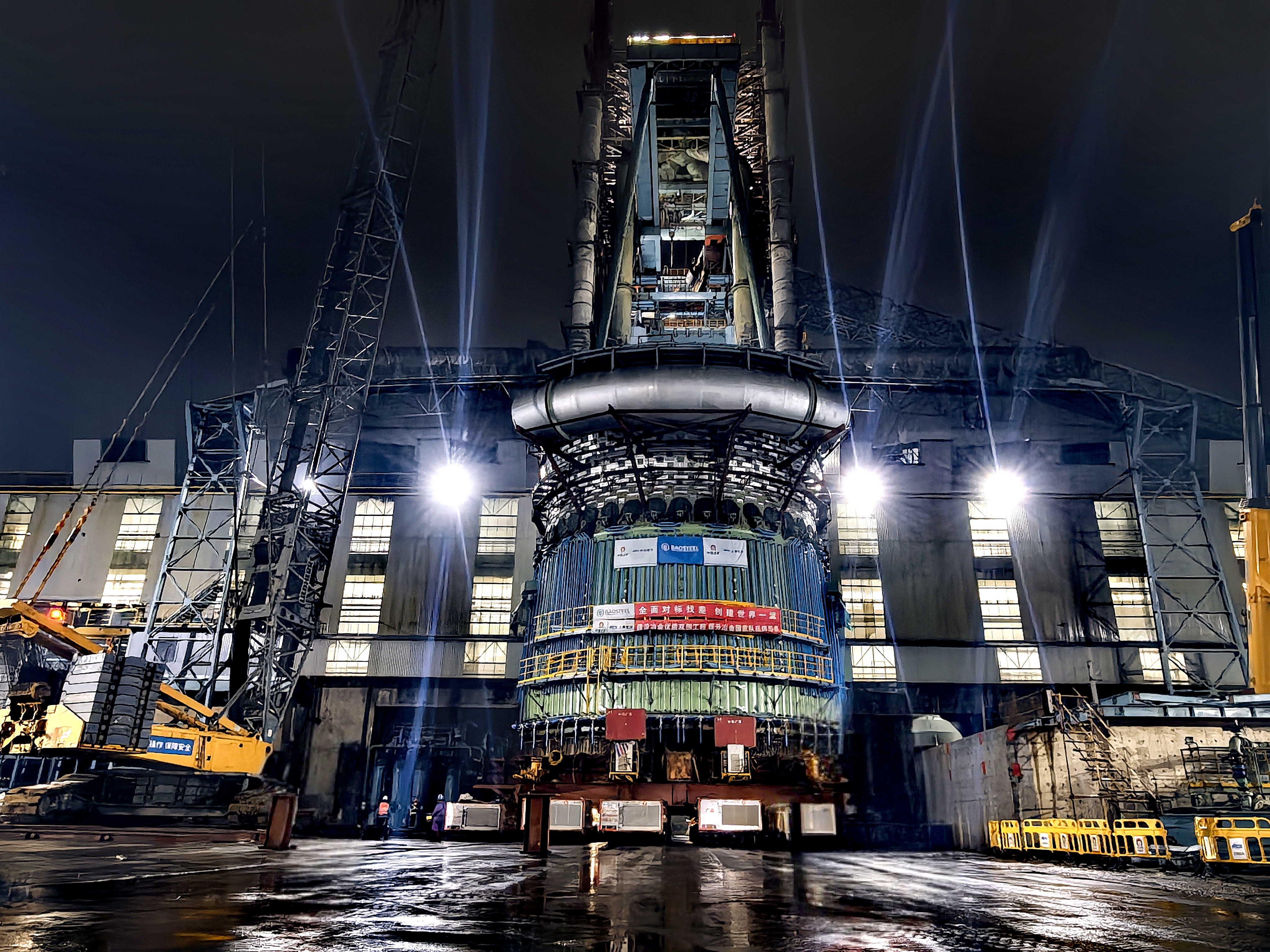 新爐體回裝采用倒裝法,嚴格遵循上段優先、分段轉運、精準拼裝的施工原則,依托爐頂液壓提升成套設備和智能管控體系,實現爐體升降調控、精準就位,全方位保障安裝精度與結構施工質量。首先完成爐體上段場內轉運,將爐體精準抬升至超出中段爐體頂部的預設標高,完成機械鎖緊與安全加固。隨后將成型組合模塊實施整體頂升定位,采用滑移加模塊車運輸的模式將爐體下段精準移送至指定安裝點位,并有序下放一體化組合模塊,與下段爐體實現無縫貼合對接,高標準完成整套爐殼整體回裝作業。